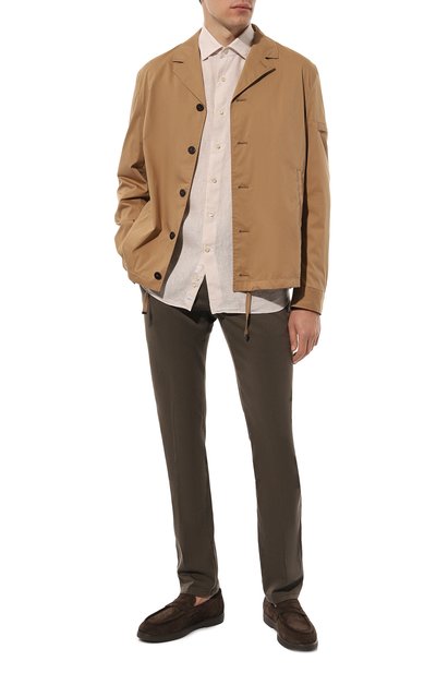 Коричневые брюки со стрелками одинаково хорошо рифмуются с вещами как из повседневного, так и из офисного гардероба. Для пошива модели с клетчатым микроузором мастера марки использовали мягкую шерсть, в состав которой добавили легкий дышащий лен и прочный шелк. Пояс дополнили эластичными боковыми вставками.