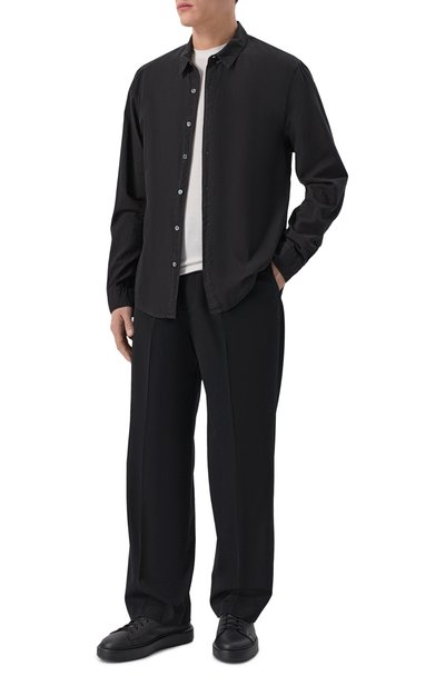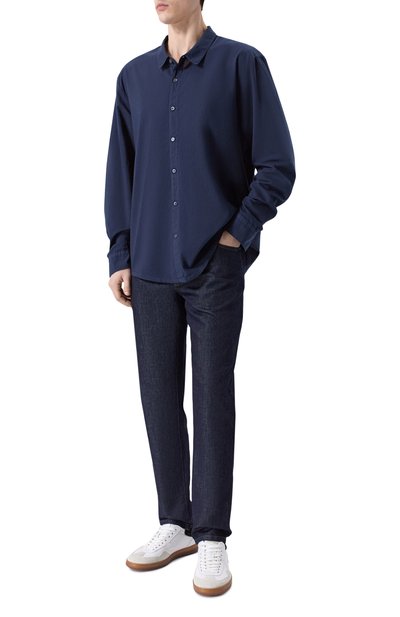 Темно-синюю однотонную рубашку с длинными рукавами и отложным воротником сшили из гладкого шелковистого хлопка. Чтобы модель получилась особенно мягкой, ее окрасили в готовом виде, используя специальные кондиционеры и силикон. Изделие без декора можно носить как на голое тело, так и поверх тонкой футболки.
