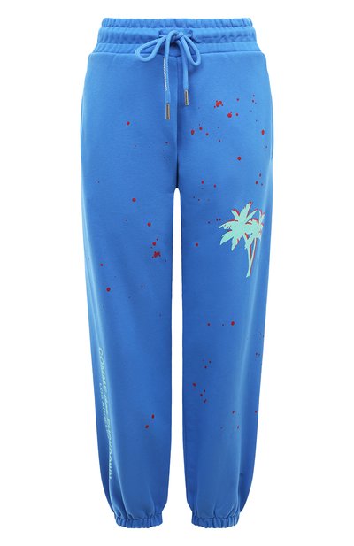 Голубые джоггеры с логотипом бренда, принтом в виде пальмы и крупными брызгами красной краски можно оттенить нейтральными вещами, но наши стилисты предлагают носить их с парным худи. Модель выполнили из мягкого хлопкового трикотажа. За удобную посадку на талии отвечает широкий эластичный пояс-кулиска.