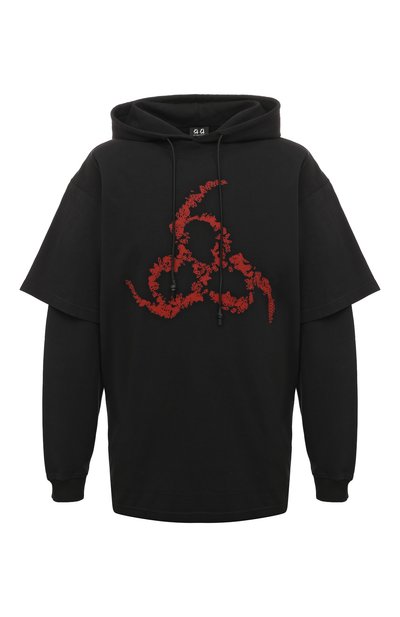 Черное худи с капюшоном, регулируемым кулиской, и двухслойными рукавами украшено спереди крупным принтом, а сзади — логотипом бренда. Модель силуэта оверсайз сшита из мягкого хлопкового трикотажа, позволяющего телу дышать и сохран яющего тепло. Предлагаем создать образ в стиле streetwear с брюками в тон и серыми кроссовками.