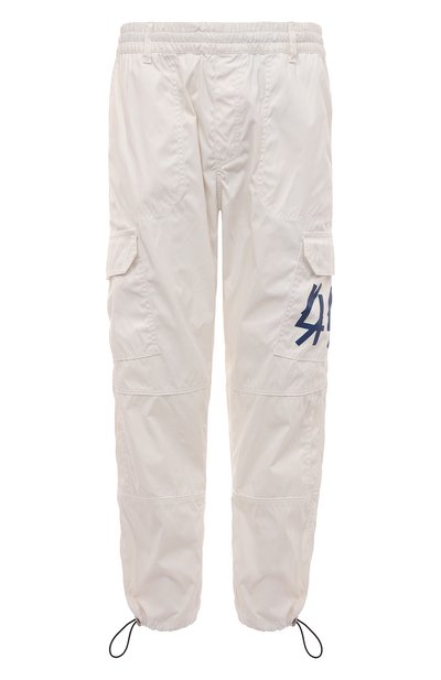 Для пошива белых джоггеров мастера марки использовали прочный шелковистый нейлон. Изделие из такого материала почти не мнется и не растягивается со временем, долго сохраняя безупречный вид. Модель с широким эластичным поясом и регулируемыми манжетами дополнили накладными карманами, как у карго, один из которых подчеркнули синей эмблемой бренда.