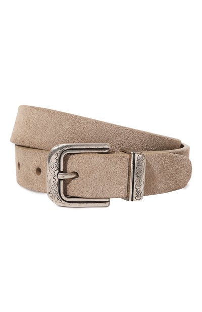 Команда марки придала бежевому ремню вид вещи с историей, украсив прямоугольную пряжку и тренчик оттенка античного серебра выгравированным узором, подчеркнутым чернением. Для изготовления аксессуара средней ширины использовали особенно прочную и приятную на ощупь бархатистую замшу.