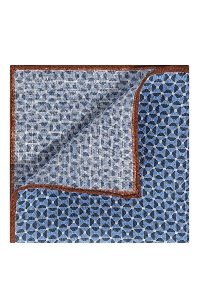 Голубой платок с узким коричневым кантом украсили геометрическим принтом с трехмерным оптическим эффектом. Аксессуар выполнили из тонкого легкого льна. Пористые волокна этого материала неравномерно впитывают пигмент, поэтому модель приобрела слегка неоднородный оттенок.