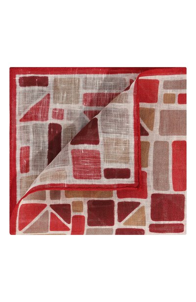 Мастера марки выполнили красный платок из прочного тонкого льна, характерная неравномерная фактура которого добавила выразительности геометрическому узору, напоминающему пазл. Орнамент заключили в узкую рамку в тон основному оттенку аксессуара.