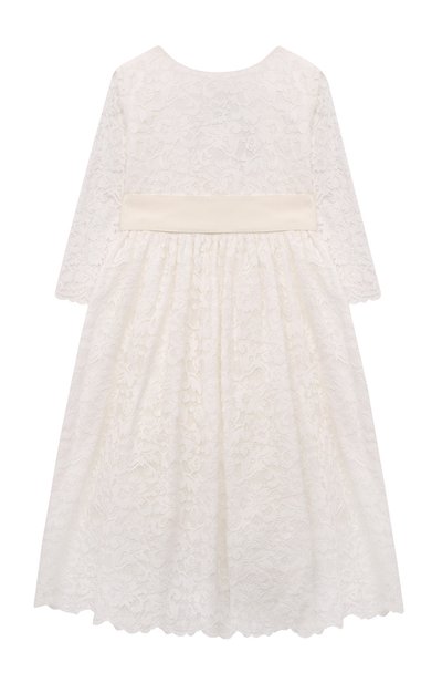 Для создания белого платья с пышным подолом и рукавами длины 3/4 использовали изысканное цветочное кружево, которое тянется, не мешая движениям. Чтобы в ажурной модели было комфортно, ее дополнили подкладкой из дышащего хлопка. Талию подчеркнули широкой репсовой лентой, завязывающейся на большой бант. Изделие с V-образным вырезом, открывающим спину, застегивается потайной молнией сзади.