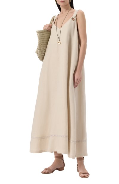 Босоножки Portofino на шпильке средней высоты призваны оставаться невидимыми в образе. Пара ремешков и высокий задник почти не скрывают стопу, а матовая наппа правильного бежевого оттенка буквально сливается с кожей. Таким же материалом обтянута и круглая пряжка на щиколотке, поэтому на обуви нет ни единой контрастной детали.