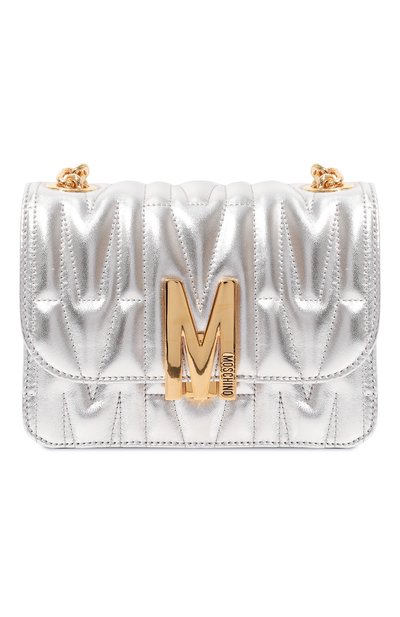 Серебристая сумка громко заявляет о своей принадлежности бренду: модель выполнили из мягкой металлизированной кожи со стеганым узором в виде эмблемы марки, основанной Франко Москино. Орнамент поддержали крупным замком в форме литеры М. Внутрь поместятся телефон, картхолдер, ключи и зеркало. Аксессуар дополнили скользящим плечевым ремнем-цепочкой, который можно превратить в две короткие ручки.