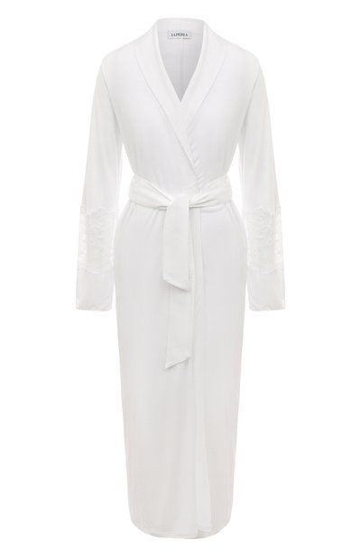 Предельно тонкое джерси из мягкого модала сделало длинный белый халат почти невесомым и просвечивающим. Трикотажу вторит кружево с цветочным узором, из которого выполнены широкие вставки на рукавах. Непрозрачными остались лишь шалевый воротник и пояс-лента, фиксирующий модель на талии.