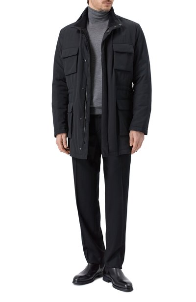 Мастера марки выполнили коричневую куртку из матового полиэстера с особенно плотным переплетением нитей. Такой материал не продувается ветром и хорошо удерживает тепло. Чтобы обеспечить больший комфорт, модель с потайной кулиской дополнили слоем наполнителя, сохраняющего оптимальный микроклимат. В кармане на воротнике-стойке скрыли капюшон.