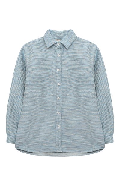 Для изготовления голубой рубашки с длинными рукавами и отложным воротником мастера марки использовали мягкий хлопковый твид. Модель деликатно мерцает в лучах света миниатюрными пайетками, вплетенными в ткань. Изделие застегивается пуговицами, инкрустированными прозрачными кристаллами.