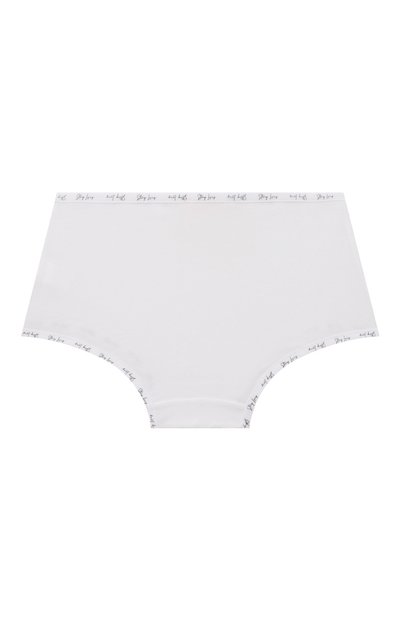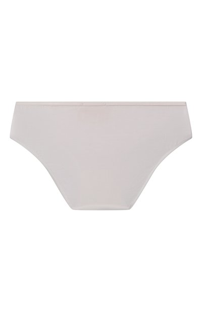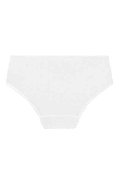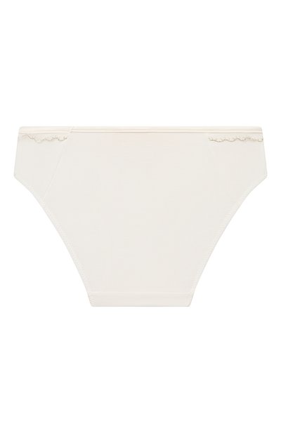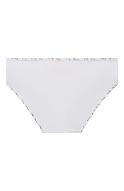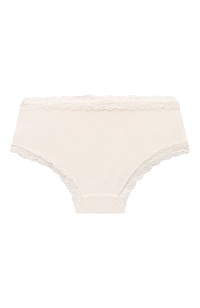Для пошива белоснежных слипов мастера марки использовали тонкий эластичный трикотаж из нежного модала. Гипоаллергенный материал хорошо пропускает воздух, быстро впитывает и отводит влагу и легко тянется, обеспечивая комфортную посадку. На узком поясе спереди трусы украсили кружевной оборкой с миниатюрным атласным бантом и сверкающим кристаллом.