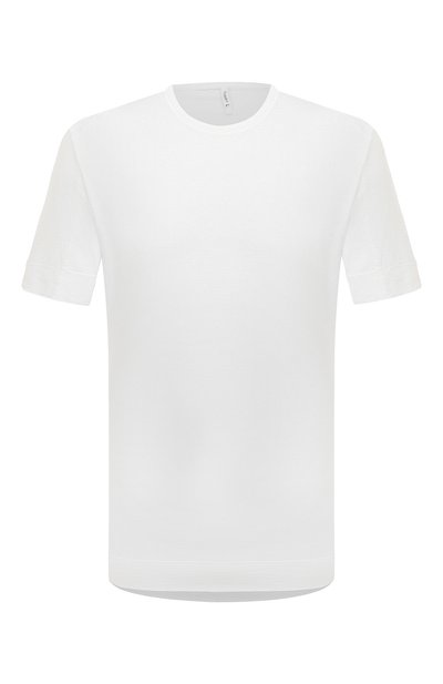 Очищенную от декора белую футболку с круглым вырезом и рельефными швами на коротких рукавах мастера марки сшили из мягкого тонкого хлопка. Материал из длинных отборных волокон с добавлением льна хорошо пропускает воздух, поэтому в модели из него будет комфортно в течение дня.