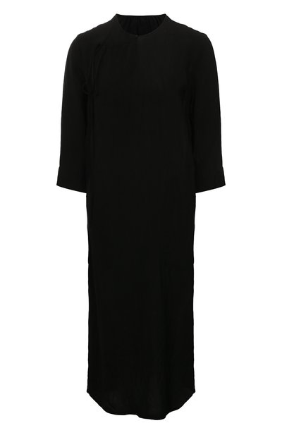 На примере этого черного платья Ума Ванг доказала, что лаконичная вещь тоже может выглядеть провокационно. Для пошива изделия дизайнер выбрала полупрозрачную шелковистую вискозу. Высокие боковые разрезы приоткрывают ноги в движении.