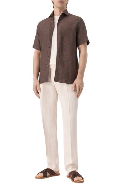 Белые брюки со стрелками – универсальный вариант, который будет уместно смотреться и в городе, и на морском побережье. Для пошива модели мастера марки, основанной Стефано Риччи, использовали тонкую льняную ткань. Материал особенно хорошо пропускает воздух, быстро отводит влагу и поддерживает на коже ощущение свежести. Изделие с эластичным поясом украсили на заднем кармане золотистой эмблемой.