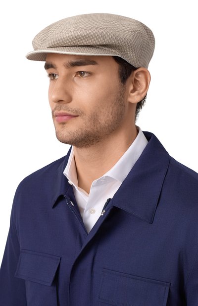 Силуэт бежевого кепи с чуть изогнутым козырьком вдохновлен головными уборами таксистов. Вместо однотонных утилитарных тканей для пошива использовали фактурный клетчатый текстиль, в котором переплелись самые благородные волокна. Отборная шерсть соединена с кашемиром из пуха горных коз, легким льном и гладким шелком. Такой микс одновременно защищает от прохлады и не мешает коже дышать.