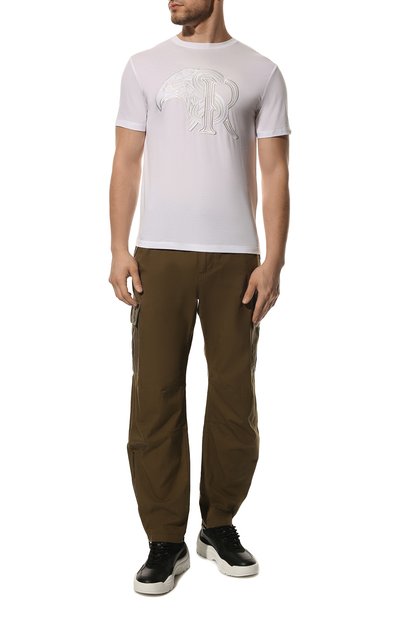 Белую футболку украсили спереди едва заметным паттерном в тон из логотипа марки, поверх которого разместили темно-синюю вышитую эмблему. Модель с короткими рукавами и круглым вырезом сшили из гладкого джерси, в составе которого поровну соединили хлопок и модал. Мягкий материал хорошо пропускает воздух, поэтому в изделии будет комфортно.