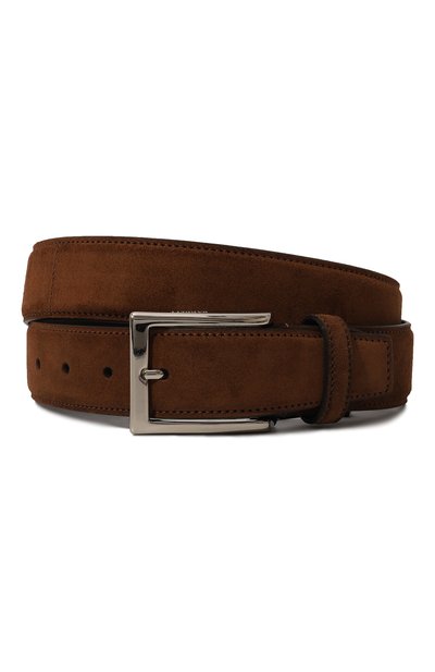 Ремень насыщенного табачного цвета выполнили из матовой замши с выразительной фактурой. Этот мягкий материал тщательной выделки получился одновременно пластичным и прочным, поэтому аксессуар станет удачным вложением в гардероб. На серебристой прямоугольной пряжке есть небольшой выгравированный логотип марки.