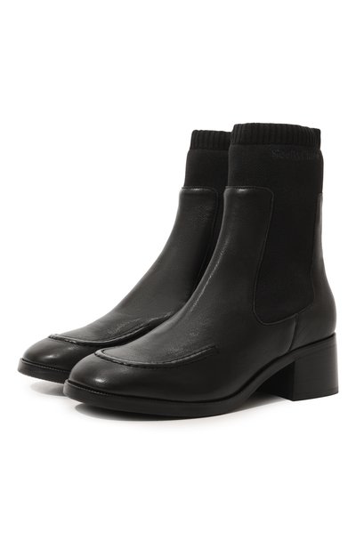 Габриэла Херст объединила в черных ботильонах Wendy черты классической и менее формальной обуви. Силуэт, позаимствованный у челси, стал чуть массивнее, на круглом мысе появился объемный шов, как у лоферов, на голенище — вставка, имитирующая носки. На контрасте с этой вязаной деталью играет плотная мелкозернистая кожа, отшлифованная до деликатного блеска.