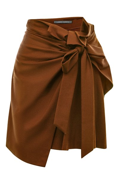 Для изготовления коричневой мини-юбки с плиссированной вставкой и скульптурной драпировкой, увенчанной крупным бантом на поясе, Альберта Ферретти выбрала мягкий шерстяной габардин. Модель из такого легкого, шелковистого на ощупь материала почти не ощущается на теле и при этом поддерживает оптимальный микроклимат.