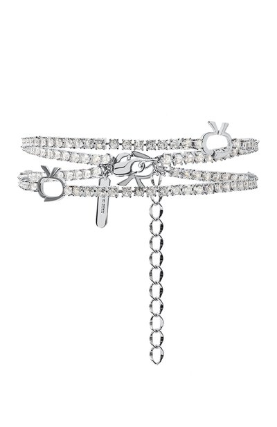 Мастера марки собрали цепочку из миниатюрных звеньев, для производства которых использовали легкий ювелирный сплав с глянцевым серебряным покрытием. Чтобы украшение сияло ярче, детали украсили вставками из кубического циркония, вспыхивающими в лучах света. Роль еще одного декора отдали деталям в виде знаковой для бренда ленты.