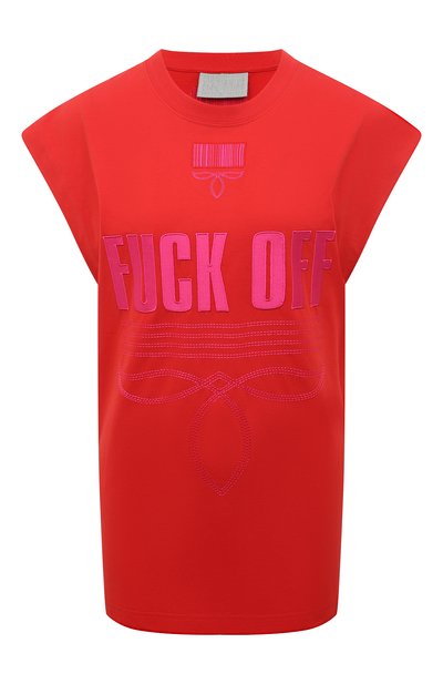 Свободную алую футболку без рукавов декорировали спереди крупной розовой вышивкой в виде надписи и штрихкода. Сзади разместили такой же мотив, но зеркально отраженный. Для пошива модели мастера марки использовали мягкое хлопковое джерси, которое хорошо пропускает воздух и не перегревает кожу в теплую погоду.