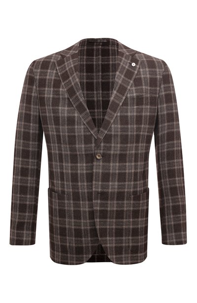 Для пошива темно-коричневого пиджака с крупным клетчатым узором мастера марки использовали приятный на ощупь шелк с добавлением шерсти. Изделие из такого тонкого, при этом плотного материала обеспечивает естественную посадку по фигуре. Нашим стилистам нравится сочетать модель с монохромными вещами, например, с бежевыми брюками и футболкой. В комплекте — миниатюрная брошь, которой можно украсить петлицу на лацкане.