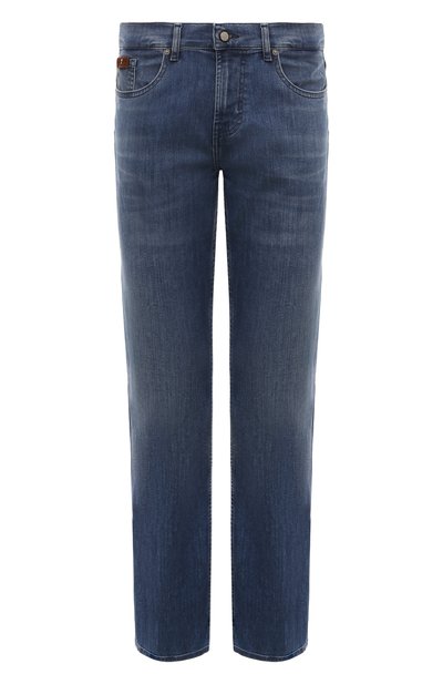 Синие джинсы прямого кроя сшиты из эластичной ткани Luxe Performance Eco. Материал на основе хлопка отлично пропускает воздух, а одежда из него безупречно садится по фигуре и не ограничивает движения. Брюки украшены коричневыми замшевыми патчами с логотипами бренда. Предлагаем создать образ с футболкой, бомбером и кедами в тон.