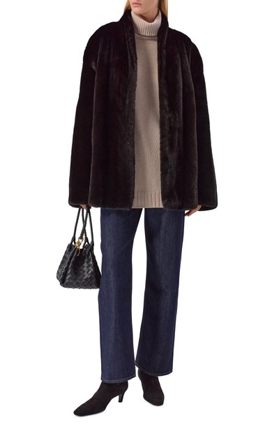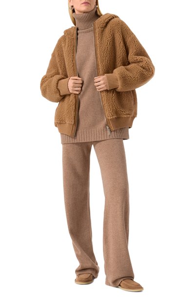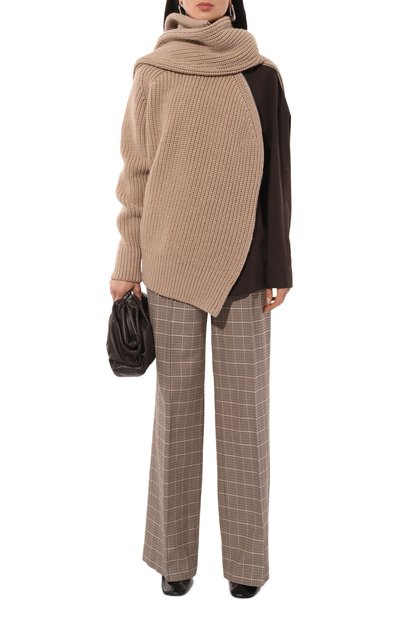Для создания бежевого свитера мастера марки использовали приятную на ощупь кашемировую пряжу. Одежда из такого материала поддерживает комфортный микроклимат и не колется, а благодаря свободному силуэту и рукавам реглан она не сковывает движения. Наши стилисты предлагают сделать вещь основой расслабленного повседневного образа.