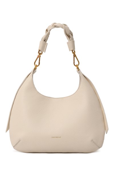 Небольшую кремовую сумку хобо Chariot с плетеной ручкой мастера марки сшили из матовой зернистой кожи, на которой долго не появятся заломы и царапины. Аксессуар, декорированный длинными лентами по бокам и миниатюрным тисненым логотипом на передней панели, застегивается на магнитную кнопку. В основное отделение поместятся кошелек, смартфон и футляр с очками.
