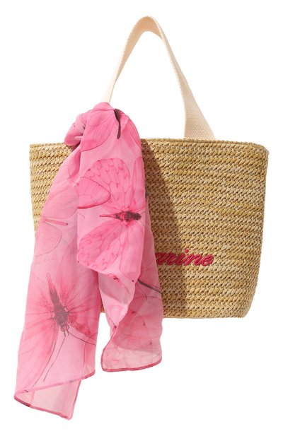 Мастера марки вручную сплели бежевую сумку из прочного материала, стилизованного под соломку. Принадлежность модели бренду обозначили яркой вышивкой в виде логотипа, а на одну из широких текстильных ручек повязали тонкий пастельно-розовый платок с цветочным принтом. В основное отделение с шелковистой внутренней отделкой поместятся солнцезащитный крем, бу тылка воды и шлепанцы.