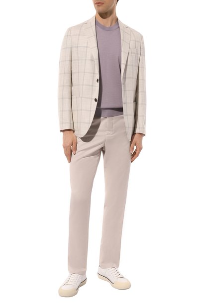 Светло-бежевые брюки слегка зауженного кроя комфортно садятся по фигуре и не сковывают движения. Модель с небольшими защипами спереди выкроили по выверенным лекалам из легкой тонкой шерсти и тщательно подогнали детали, многократно их отпаривая. Широкий пояс дополнили эластичной вставкой, делающей посадку более удобной.