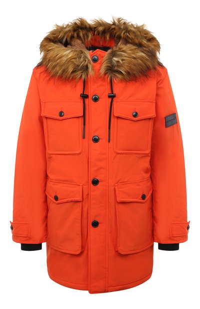 Оранжевую парку с крупными накладными карманами мастера марки сшили из плотного непродуваемого материала на основе прочного полиэстера. Для дополнительной защиты от ветра и холода предусмотрели слой легкого наполнителя, глубокий капюшон с отделкой из экомеха и штормовую пуговичную планку, под которой скрыли молнию. Рукава дополнили патами, а пояс — кулиской.