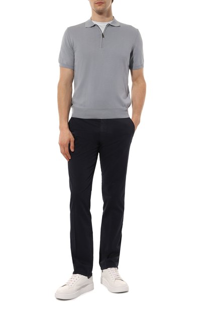 Поло с короткой пуговичной планкой сшили из гладкого хлопка с атласным блеском. В тон основному оттенку выполнили вышивку в виде знакового октагона и тотемного орла.