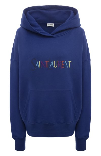 Худи глубокого синего цвета делает ярче разноцветный вышитый логотип марки, основанной Ивом Сен-Лораном, спереди. Для пошива свободной модели использовали мягкий дышащий футер. В меру плотный материал с фактурной изнанкой связали из органического хлопка, произведенного с заботой о природе, поэтому изделие получилось и комфортным, и экологичным.