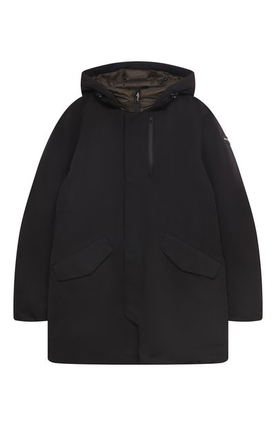 Черная парка с капюшоном и тремя врезными карманами изготовлена из прочного матового текстиля. Гладкий материал не промокает и не продувается, за тепло отвечает слой невесомого утиного пуха внутри. Однотонная куртка с боковыми разрезами, застегивающимися молниями, не сковывает движения.