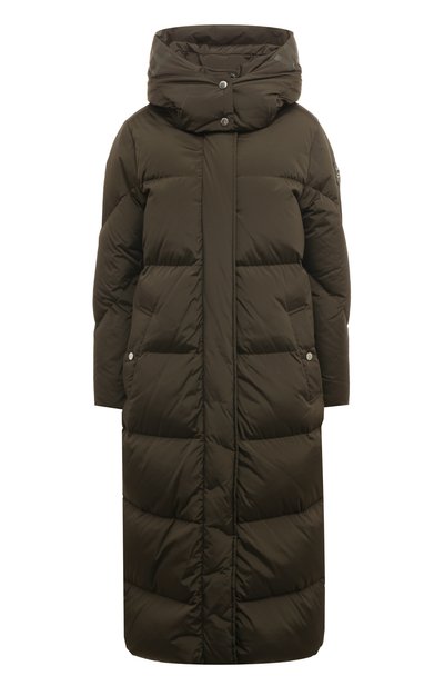 Длинный темно-зеленый пуховик не пропустит холод и ветер — в производстве модели использовали непродуваемый нейлон и объемный утеплитель, не скатывающийся за счет горизонтальной строчки. Кроме центральной застежки, скрытой под широкой планкой, предусмотрели боковые молнии, чтобы изделие не сковывало шаг. На принадлежность марке указывают эмблема на рукаве и логотип на съемном капюшоне.