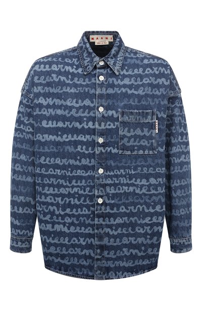 Син яя джинсовая рубашка справится с ролью легкой куртки в прохладный ветреный день. Для пошива модели использовали плотный непродуваемый деним с мотивом Maremarni: словно выбеленные надписи выполнили с помощью лазера. Изделие с отложным воротником и накладными карманами застегивается пуговицами.