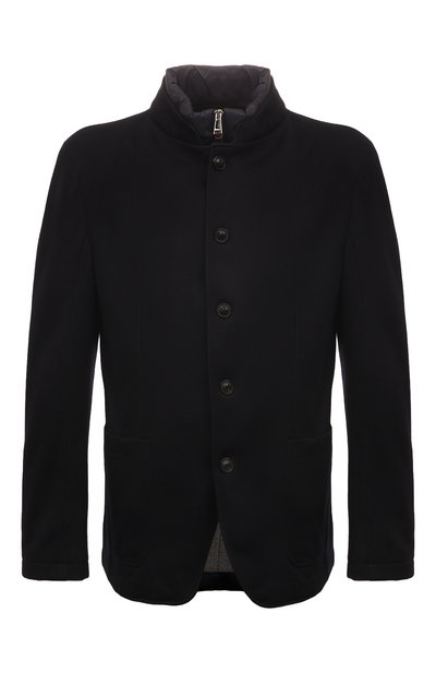 Силуэт темно-синей лаконичной куртки дизайнеры марки позаимствовали у пиджака. Для изготовления модели с двумя шлицами выбрали мягкий плотный трикотаж с добавлением шерсти. Такой материал немного тянется, обеспечивая свободу движения. Изделие утеплили стеганой вставкой с высоким воротником, которую можно отстегнуть.