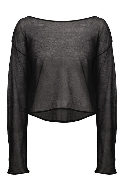 Несмотря на глубокий черный цвет укороченный пуловер выглядит воздушно. Изабель Бененато выбрала для изготовления свободной модели со спущенной линией плеч ультратонкую хлопковую пряжу, которая делает трикотаж полупрозрачным. Изделие с краями, свернутыми в узкий ролик, декорировали фирменным патчем под горловиной сзади.