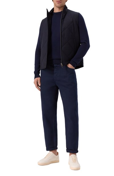 Мастера бренда выполнили темно-синий джемпер из премиального трикотажа. В составе материала объединили гладкий тонкий шелк и полые воздушные волокна монгольского кашемира. Пух для создания последнего вычесали вручную и промыли родниковой водой, поэтому материал получился особенно мягким. Полотно почти не ощущается на коже — такое изделие комфортно носить не только поверх рубашки, но и на голое тело.