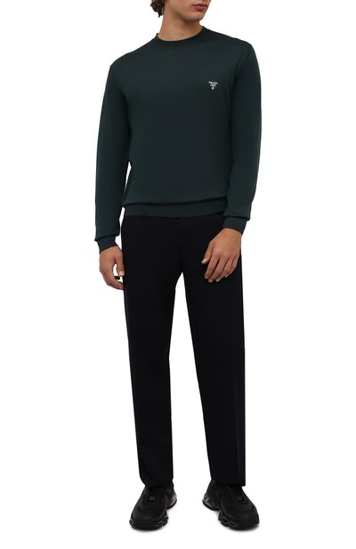 Для изготовления однотонного темно-зеленого пуловера мастера марки использовали нежный трикотаж на основе легкого кашемира, в состав которого добавили гладкий шелк. Материал особенно приятно ощущается на теле и поддерживает оптимальный микроклимат, не перегревая.