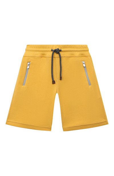 Желтые шорты сшили из мягкого хлопкового футера. В меру плотный материал, усиленный нитями нейлона, пропускает воздух так же хорошо, как джерси, а его фактурная изнанка лучше впитывает влагу. Модель с боковыми карманами на молниях дополнили эластичным поясом-кулиской, регулирующим посадку на талии.