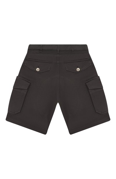Шорты с потайной молнией и роговыми пуговицами сшили из хлопкового габардина American Pima. Модель с боковыми и задними прорезными карманами дополнили карго с клапанами.