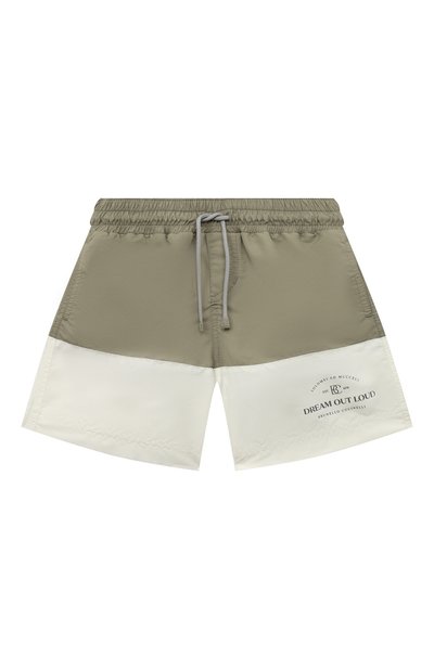 Для пошива плавок-шортов цвета хаки мастера марки использовали шелковистый тонкий текстиль, который быстро сохнет. Низ брючин выполнили из ткани на несколько тонов светлее основного оттенка, дополнив одну из таких вставок брендированным принтом. В широкий пояс-кулиску продели шнур, которым можно регулировать посадку.