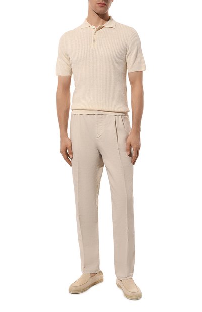 Для пошива кремового поло с короткими рукавами Даниэле Фьезоли выбрал мягкое джерси из нежного шелка с особенно тонкими прочными волокнами. Изделие из такого материала почти не ощущается на теле, комфортно садится по фигуре и оставляет на коже ощущение легкой прохлады. Лаконичная модель удачно дополнит и джинсы, и классические брюки.