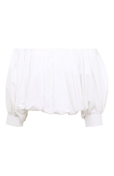 Белоснежный топ с открытыми плечами – лучший способ продемонстрировать королевскую осанку. Для пошива изделия дизайнер марки выбрал тонкий легкий хлопок. Модель с объемными драматичными драпировками сделает женственнее образ с прямыми брюками и босоножками.
