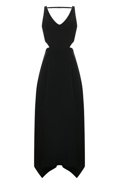 Создавая черное платье, Джун Джи поддержал глубокое декольте фигурными вырезами по бокам и открытой спиной, которую подчеркнул перемычкой. Для пошива модели с асимметричным расклешенным подолом мастера марки использовали легкий вискозный текстиль с шелковистым блеском.