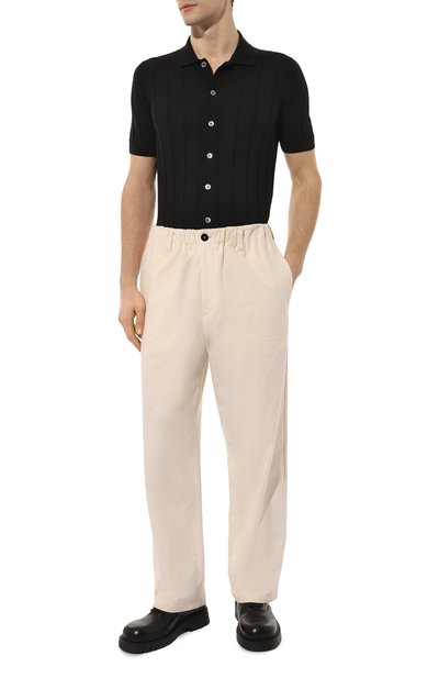 Приталенная рубашка выполнена из хлопкового трикотажа в широкую полоску. Изделие с манжетами и поясом в рубчик легко впишется в образ с брюками и дерби.