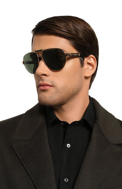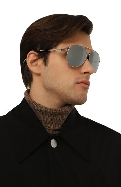 Для изготовления тонкой оправы авиаторов мастера марки использовали очень прочный легкий титан с блестящим серебристым напылением. Узкие дужки с заушниками из теплого на ощупь ацетата и широкий мост декорировали вставками из фактурной кожи. Поляризованные зеленые линзы на 100% защищают глаза от ультрафиолета и отраженных лучей, а особое покрытие предотвращает появление пятен.