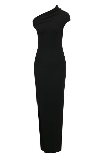 Для изготовления черного платья с высокими боковыми разрезами Рик Оуэнс выбрал нежный шерстяной трикотаж. Тонкий фактурный материал комфортно облегает фигуру и слегка тянется, не ограничивая свободы движения. Лиф украсили мягкими складками, подчеркивающими асимметричный силуэт, открывающий правое плечо.